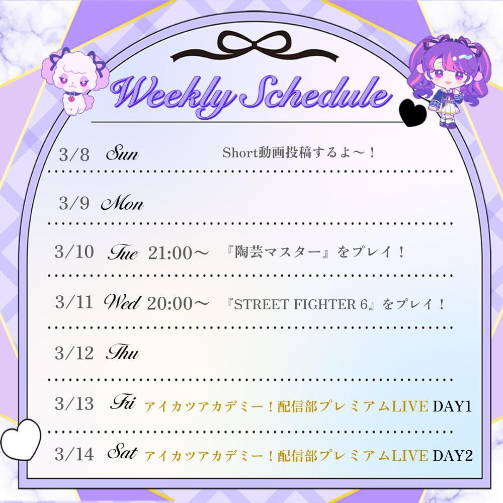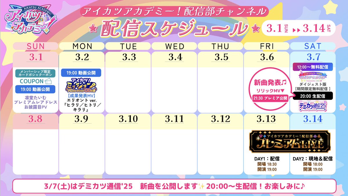 - 隔週土曜日のデミカツ通信’25、デミカツ通信がない土曜日のアイカツ!ミッション、月曜日のアイカツ!ミッションPV公開、木曜日のアイカツ!チャレンジ、週2〜4本程度のショート動画公開(配信部チャンネル)