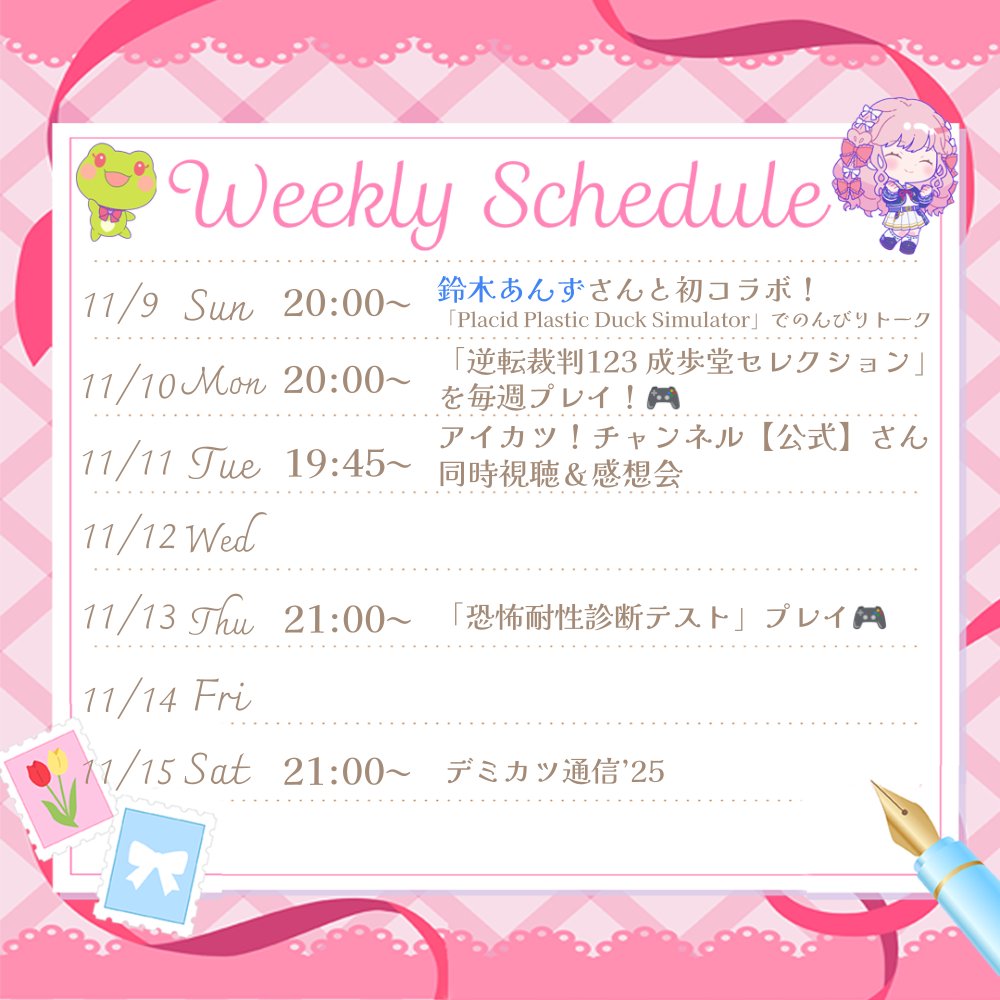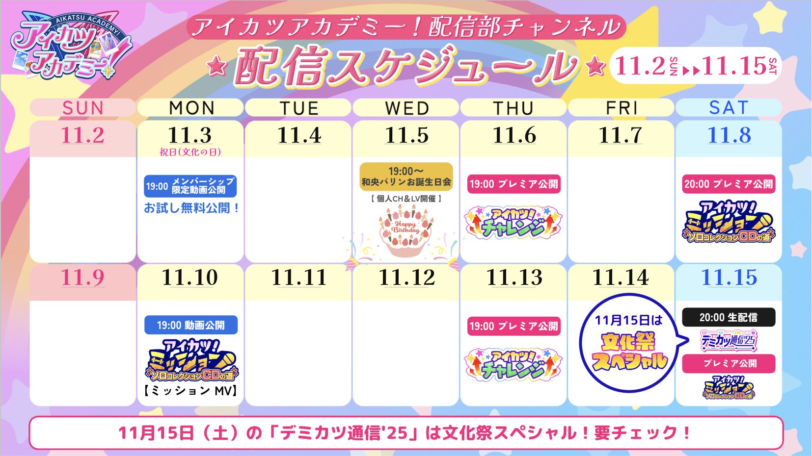 - 隔週土曜日のデミカツ通信’25、デミカツ通信がない土曜日のアイカツ!ミッション、月曜日のアイカツ!インタビュー・アイカツ!ツアーズ、木曜日のアイカツ!チャレンジ、週2〜3本程度のショート動画公開(配信部チャンネル)